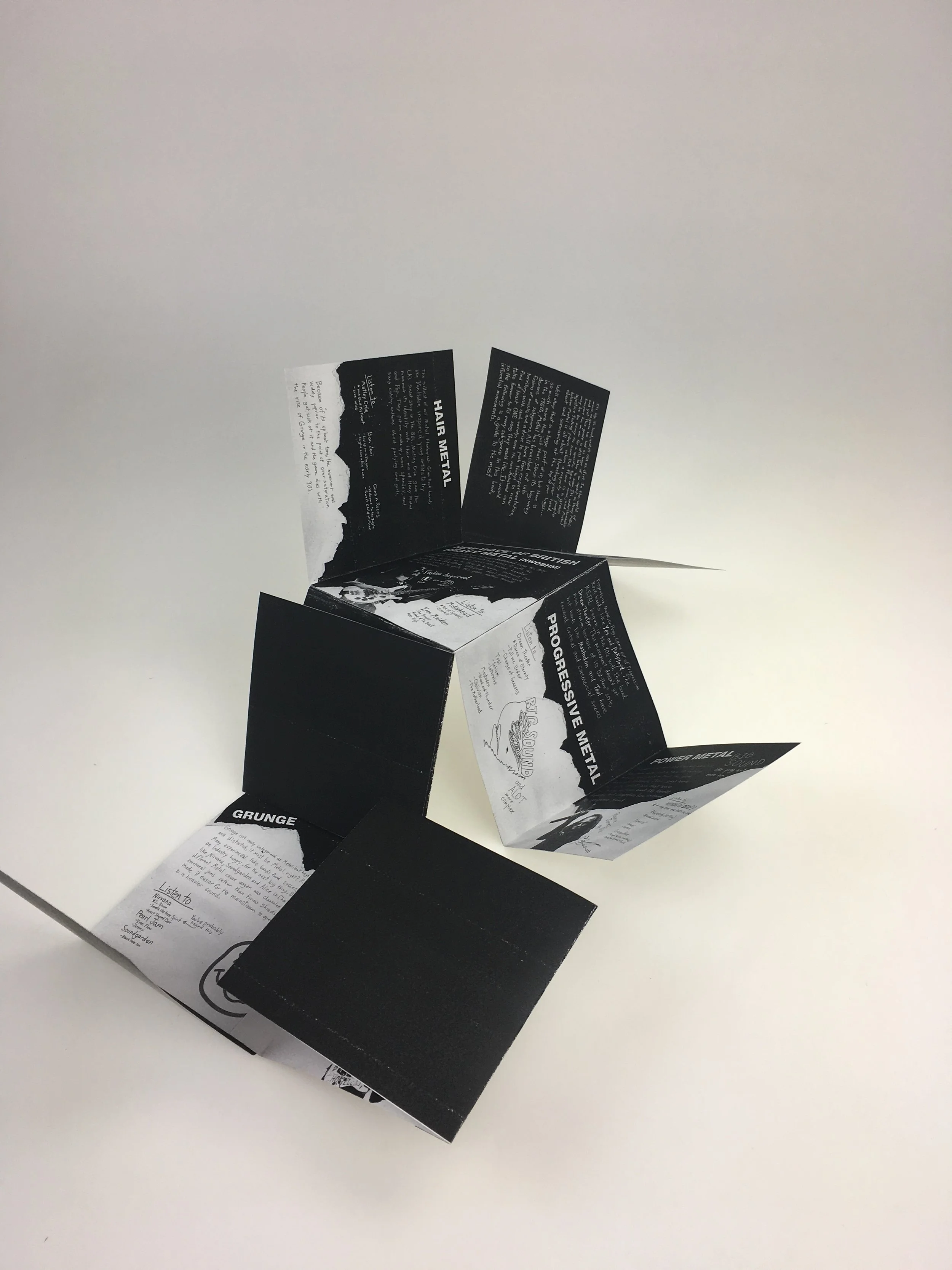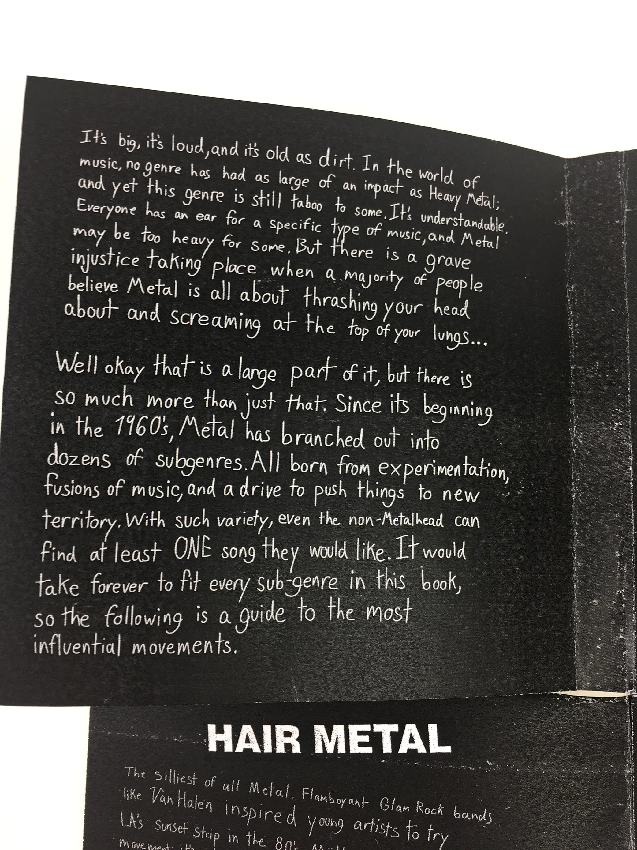 I am a big fan of Heavy Metal so I wanted to make a project that would allow me to nerd out about the genre. I wanted it to be something unique, so I made a booklet that folded out in multiple directions. By having it unfold in multiple directions, I could show how big the genre was and how one era would influence another.
